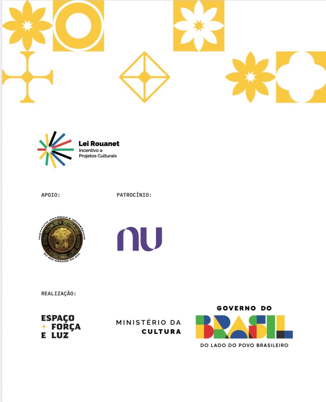 Este projeto é viabilizado com o patrocínio do Nubank e com o apoio do Instituto Histórico e Geográfico do Rio Grande do Sul, por meio da Lei Federal de Incentivo à Cultura (Lei Rouanet) - Ministério da Cultura.